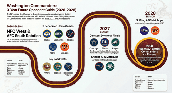 As the 2025 NFL season has concluded, Washington Commanders fans are already looking ahead to future matchups. We have the Washington Commanders future opponents and schedules here for you. Thanks to the NFL’s fixed scheduling rotation, we know the Commanders’ opponents for upcoming seasons well in advance. The formula ensures each team plays their division […]
